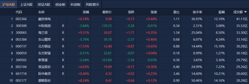 沪深两市半日成交额8497亿元,较上个交易日缩量1109亿。个股方面,融发核电成交额超41亿元居首,中际旭创、海兰信、东山精密成交额靠前。